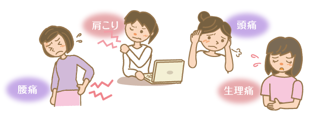 腰痛、肩こり、ぎっくり腰、偏頭痛、だるさなど